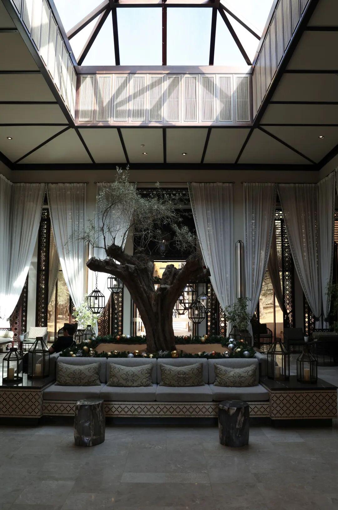 走入酒店,便是步入《一千零一夜》的现代篇章之中。建筑用色与沙漠一致,大面积绿植的精心养护在这里显得尤为不易。恢弘的开放式连廊、挑高的玻璃顶大堂、大量的白色帷幔,构建出独特的阿拉伯风情。