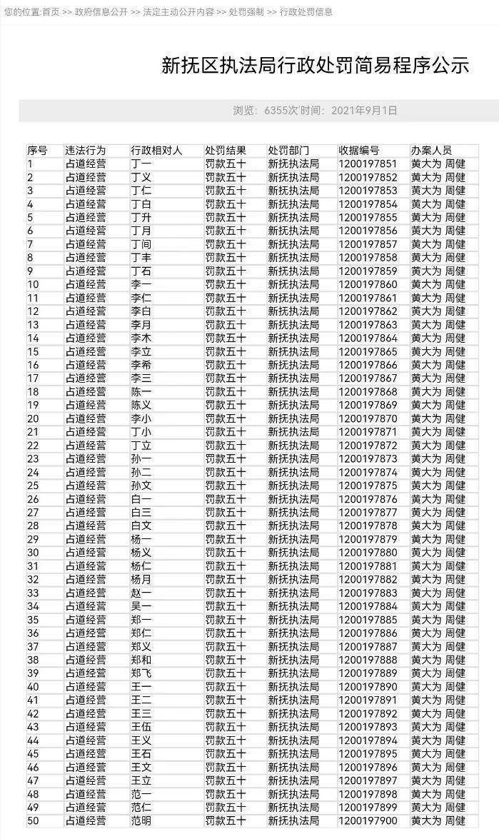 极目新闻记者还注意到,新抚区执法局2021年9月1日还公示了多人因占道经营被行政处罚的文件,名单上50人均被罚款50元,名单合计罚款2500元。该名单上被罚款的有丁一、李一、陈一、孙一、白一、赵一、吴一、郑一、杨一、王一、范一,还有丁义、陈义、杨义、王义,都是两个字的姓名。